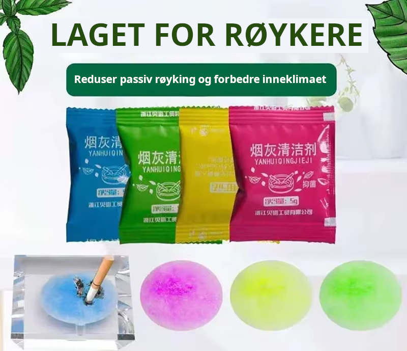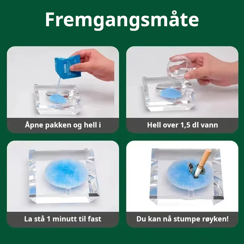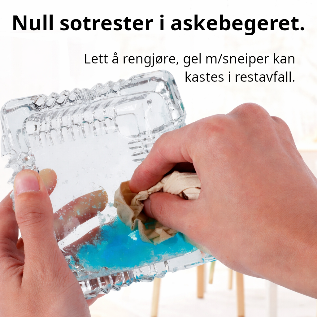 Gel kan kastes i restavfall, askebeger skylles med vann.