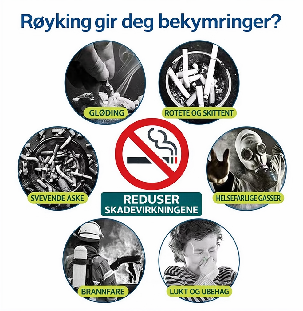 Bruksområder: Alle innendørs røyesteder som hjem, kontor, resepsjon, hotell, bar, osv. Utendørs under tak.